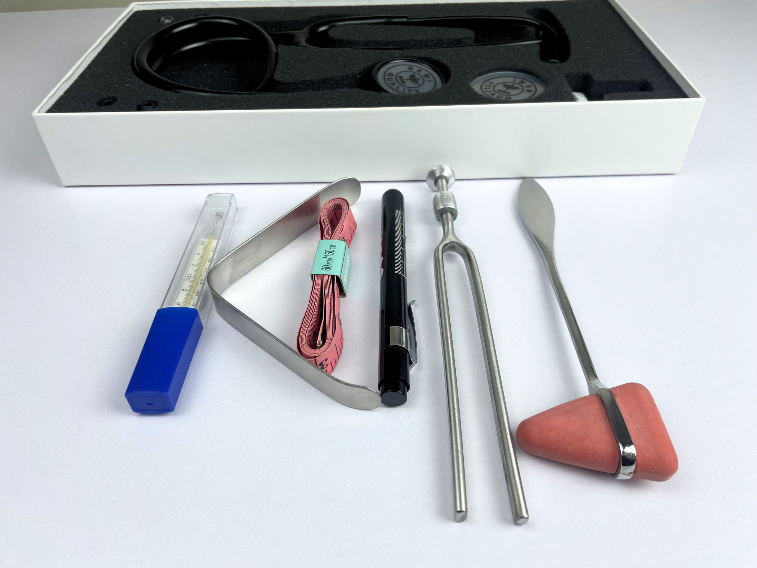 This comprehensive set includes 3 high-quality stethoscope for accurate heart, lung, and bowel sound assessment. The durable tongue depressor assists in oral and throat examinations, while the precision tuning fork supports neurological and hearing evaluations. A flexible measuring tape is included for anthropometric measurements and clinical assessments.